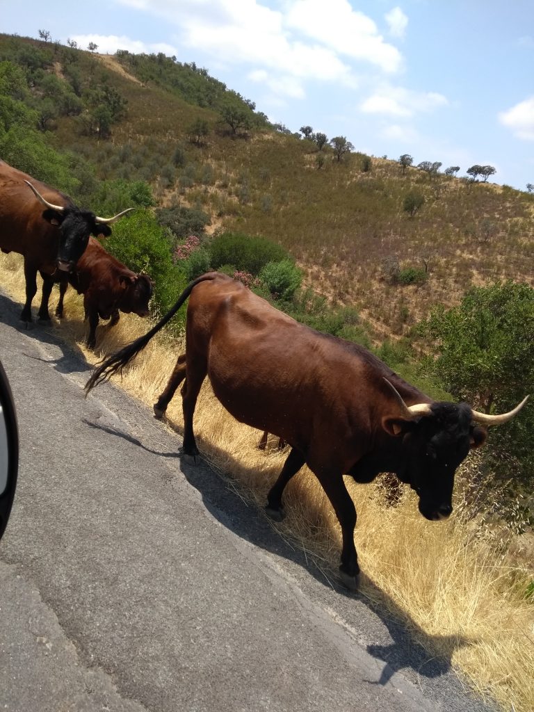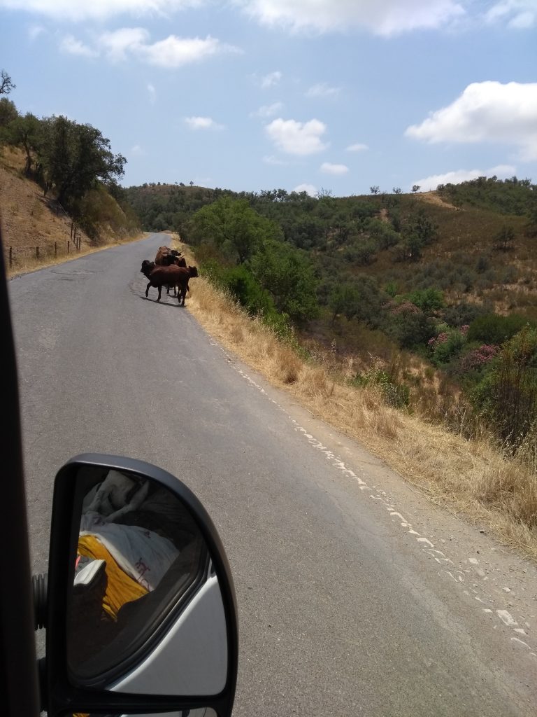 Aber nun gut, wir sind in Portugal noch wirklich nicht weit rum gekommen und wollen ja nun doch noch ein wenig mehr von diesem wunderschönen Land kennen lernen… Monika gab mir noch den Tipp doch mal bei Ihrer Freundin Natascha vorbeizuschauen die in Sao Louis Pferde stehen hat und Ausritte anbietet. Sao Luis ist auch nur 20 km weit von Milfontes entfernt. Da ich aber nach über 10 Jahren „Pferdeabstinenz“ doch mal wieder riesig Lust hatte auf einem Pferderücken zu sitzen rief ich Natascha an und konnte für Freitag den 19.07. einen Termin für einen Ausritt buchen. Bis zu diesem Termin wollten wir dann eigentlich zum Stausee Santa Clara fahren. Dort soll es einen Platz mitten in der Pampa und direkt am See geben wo man mit dem Womo autark stehen kann. Also fuhren wir am 17. Juli in Richtung Stausee. Nachdem uns auf dem Weg dort hin so einiges Viehzeug begegnete das frei rum lief und irgendwann die Straßen zu Schotterpisten mit dicken Schlaglöchern wurden, drehten wir doch wieder um. Diese Schlaglöcher wollten wir unserer Lucy nicht zumuten… Und dann waren da noch die riesigen freilaufenden Hofhunde mit denen unser Rüde Timmy sicherlich nicht die dickste Freundschaft geschlossen hätte…