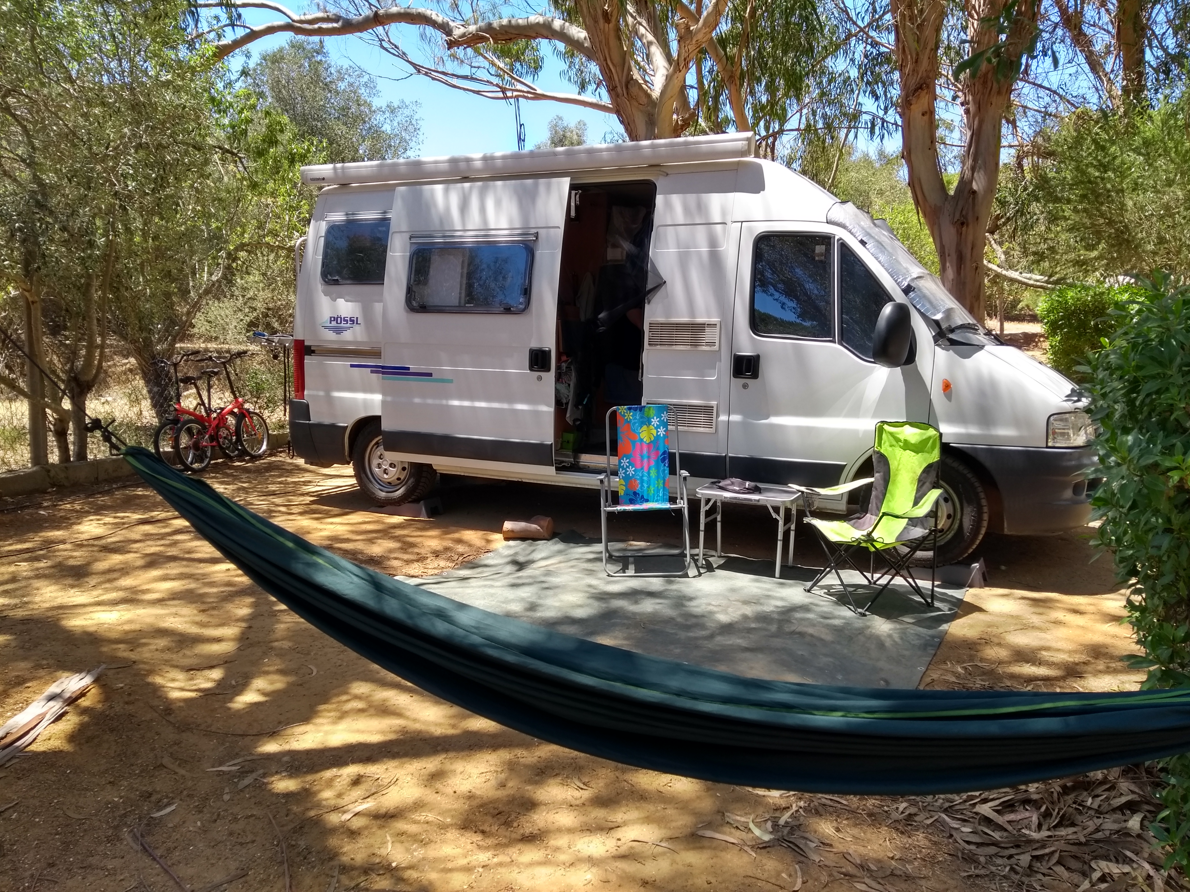 (viele schöne Schattenplätze gibt´s auf Camping Alvor. Und ich kann wieder meine geliebte Hängematte genießen!) 🙂