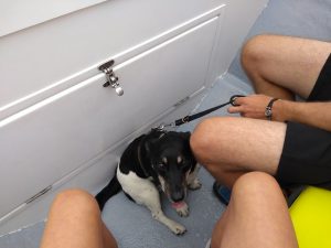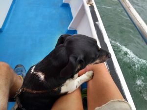 Ich sag euch, auch wenn ich jetzt schwimmen kann – mir war gaaanz schön mulmig! Hab mit dem Kiefer wie eine Klapperschlange geklappert… Aber alle Leute auf dem Boot haben mir gut zugeredt und ich hab mal wieder jede menge Streicheleinheiten abgesahnt… Also konnte ich mich bei diesen Annehmlichkeiten akklimatisieren… 🙂 Wer wird schon nicht gerne ausgiebig gestreichelt… 😉