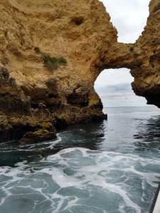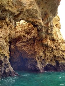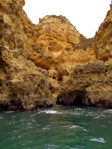 Zunächst ging es mit dieser kleinen Nussschale von Alvor auf´s Meer hinaus. Wir legten in Lagos an und ich dachte schon ich hätte alles überstanden… Aber nein; wir mussten nur von dem kleinen Boot runter um auf ein größeres Boot umzusteigen… Oh jeee