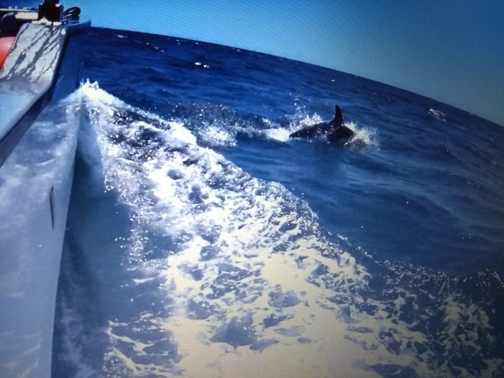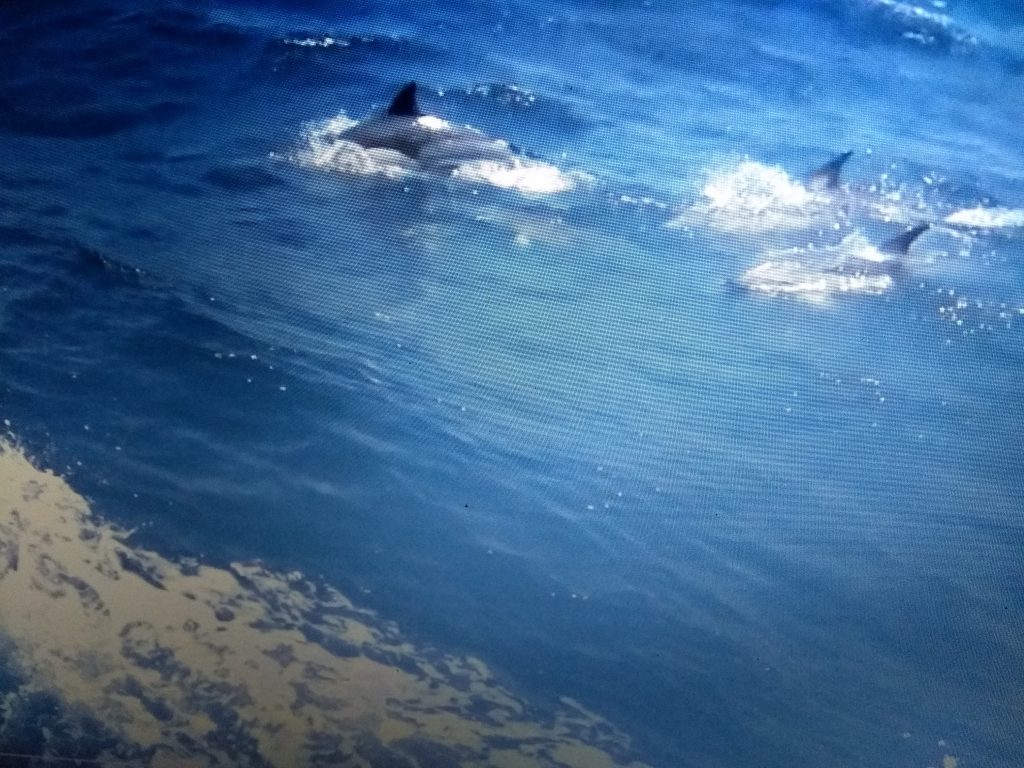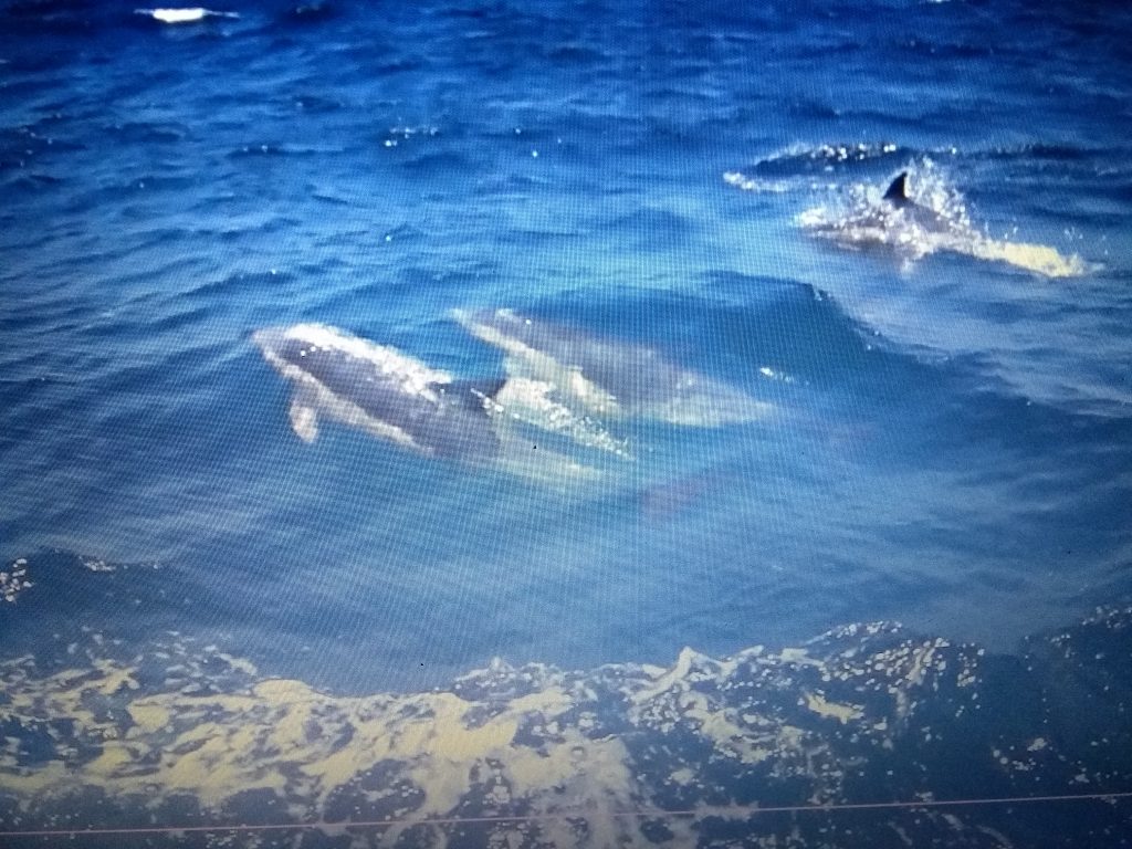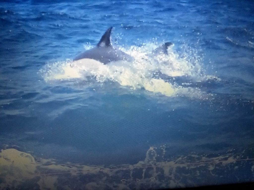 Richtig klasse ist es, daß der SeaXplorer mit den anderen 3 Anbietern von Sagres Hand in Hand arbeitet. So geben sich die Anbieter gegenseitig Informationen weiter, wann und wo die Tiere im Meer zu finden sind. Hiermit steigt die Wahrscheinlichkeit Delfine, Waale, Meeresschildkröten oder auch Haie sehen zu können auf über 95%! Außerdem wird hier im Naturschutzgebiet weder Schwärmen hinterhergejagt noch werden die Tiere angefüttert. Die Begegnungen sind somit von Seiten der Tiere völlig freiwillig! Wenn ein Anbieter einen oder auch mehrere Schwärme sichten konnte dreht er nach 30 min. zum Schutz der Tiere wieder ab. So kann man ohne schlechtes Gesissen diese wudervollen Meeresbewohner beobachten. Außerhalb dieses Naturschutzgebietes sieht das schon wieder ganz anders aus, wie uns Martina berichtet. Deswegen hier noch eine Bitte: Bitte achtet beim Buchen von Delfin- und Waltouren darauf, welche Auflagen euer Anbieter erfüllt! Wir hatten das große Glück einen Schwarm von ca. 30 Delfinen der Gattung „gemeiner Delfin“ zu begegnen. Es kommt aber wohl oft genug vor, daß auf den Touren der SeaXplorer mehrere Arten gesichtet werden. Bis vor 2 Wochen hatten die Gäste hier auch noch die Möglichkeit Orcas zu sichten, bis sie nun in Richtung Mittelmeer weitergezogen sind. Ich bin und war aber ersteinmal mehr als happy und wahnsinnig ergriffen diese Delfinfamilie beobachten zu dürfen…